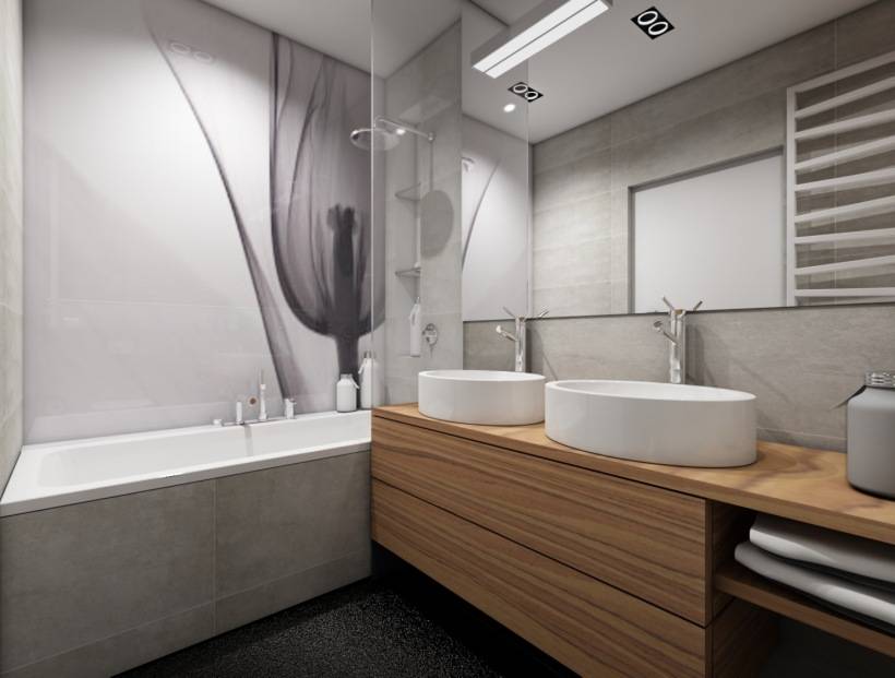 Декор в стиле минимализм подразумевает практичные решения, к тому же серый цвет – одна из особенностей данного направления в интерьере. Для лаконичного дизайна следует отделать пол и стены однотонной плиткой с глянцевой поверхностью. Строгость решения подчеркнет серая мебель и серебристая бытовая техника.