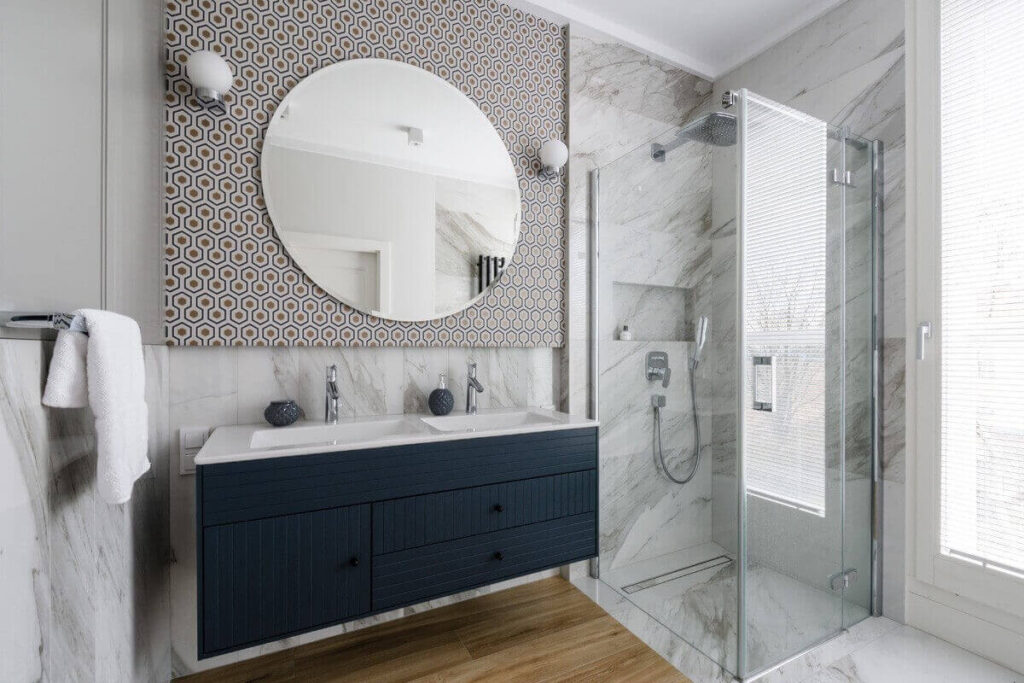 В компактных ванных комнатах лучше применяйте материал с глянцевой глазурованной поверхностью.