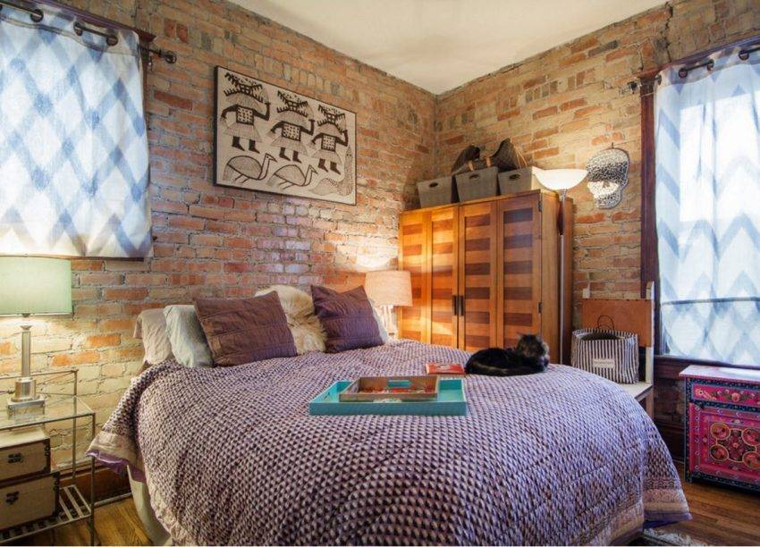 Стильный вариант оформления спальни с кирпичными стенами
