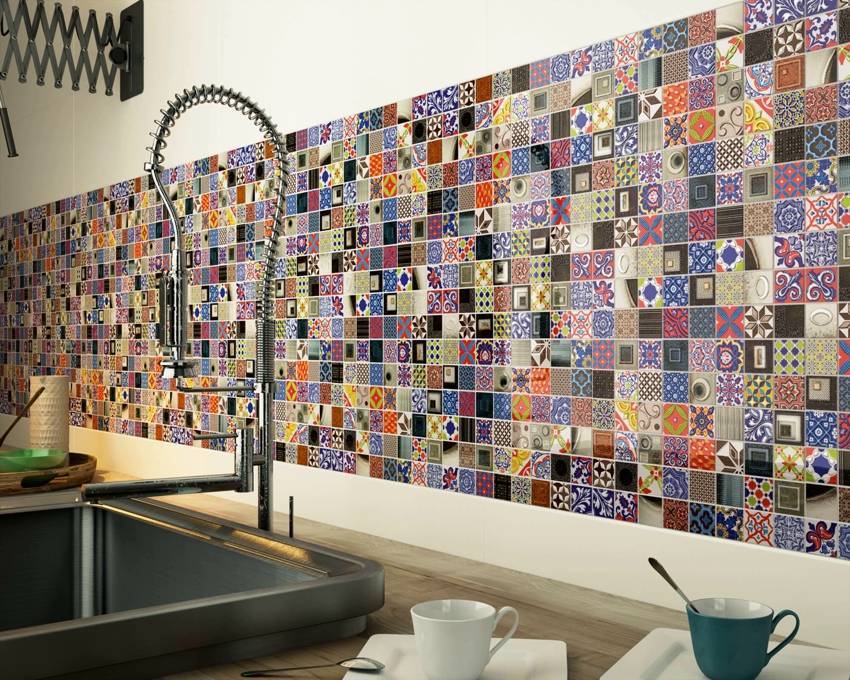 Фартук из разноцветной плитки может стать ярким акцентом интерьера