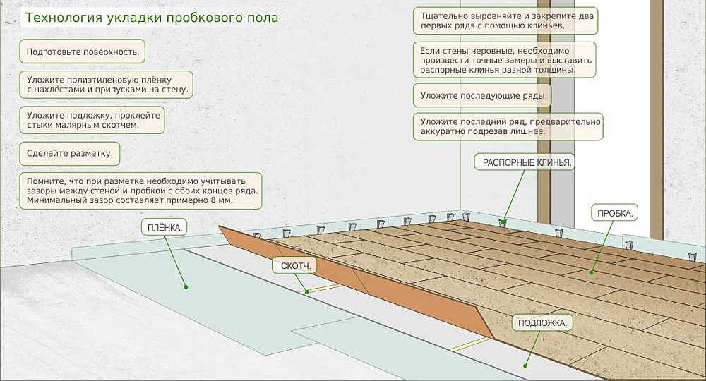 Если вы решили самостоятельно уложить клеевой пробковый пол, тогда обратите внимание на то, как проходит весь процесс. Пошагово всё выглядит следующим образом: