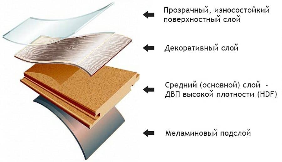 Для создания невероятно прочного верхнего слоя используется меламиновая смола. Несущий слой будет изготовлен из ДВС или ДВП. Таким образом удается добиться оптимального показателя долговечности, влагостойкости и прочности. Нижний же слой представляет собой материю, состоящую из смол, картона и бумаги, которую она пропитывает. Водоотталкивающий слой создается с обеих сторон ламината.
