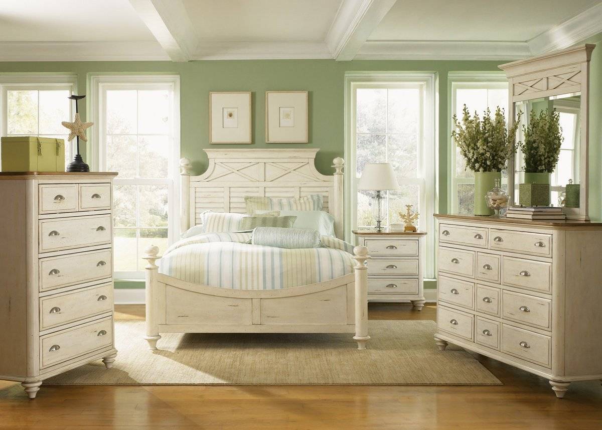 Пастельные тона. Сочетание нежных красок в интерьере спальни создает иллюзию близости к природе. В отделке комнат используются приглушенные цвета — слоновой кости, бежевый, бледно-голубой, оливковый, шафранный. Уют и спокойствие ощущается в комнатах, оформленных с акцентом на жемчужные, сливочные, пудровые тона. Цветочные орнаменты. Предпочтение при выборе штор, покрывал отдают натуральности, легкости тканей. При украшении текстиля используют вышивку. Флористическими орнаментами расписывают декоративные элементы или делают декупаж. Состаренная мебель. Особенность французского кантри – печать времени на предметах интерьера