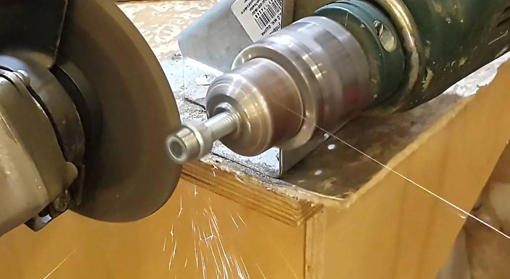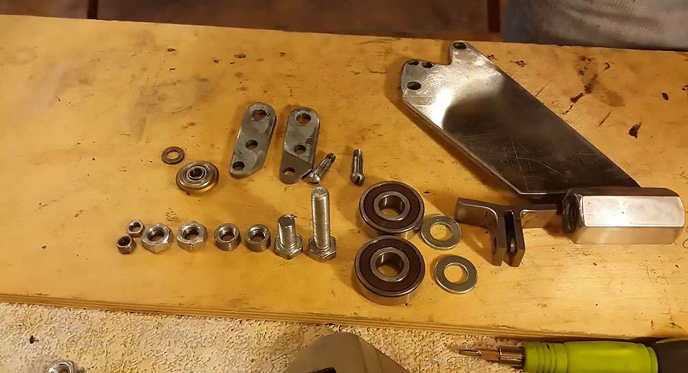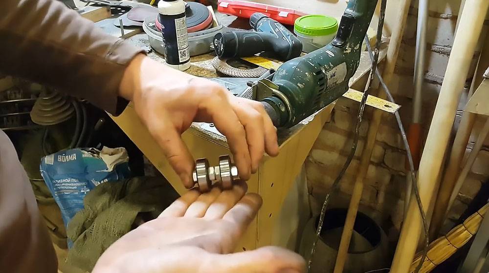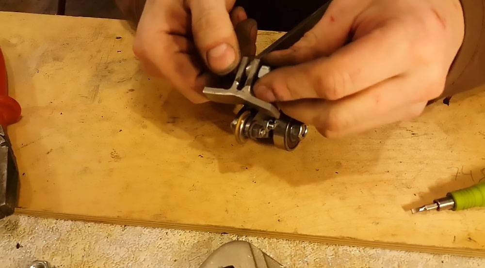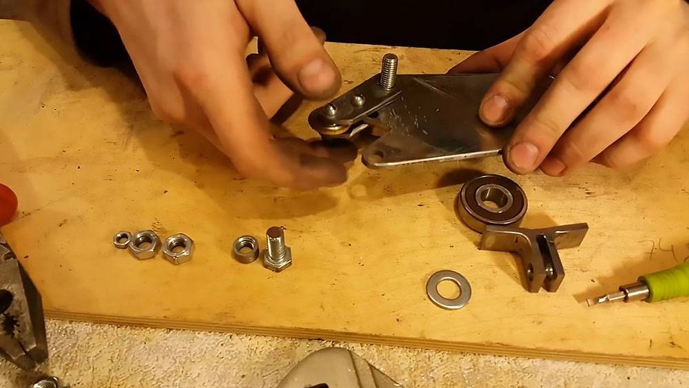 Для перемещения каретки в конструкции инструмента используют подшипники, осью которых выступают болты. А чтобы предупредить их люфт, из обыкновенных гаек изготавливают промежуточную втулку. Для этого болгаркой у гаек стачивают грани.
