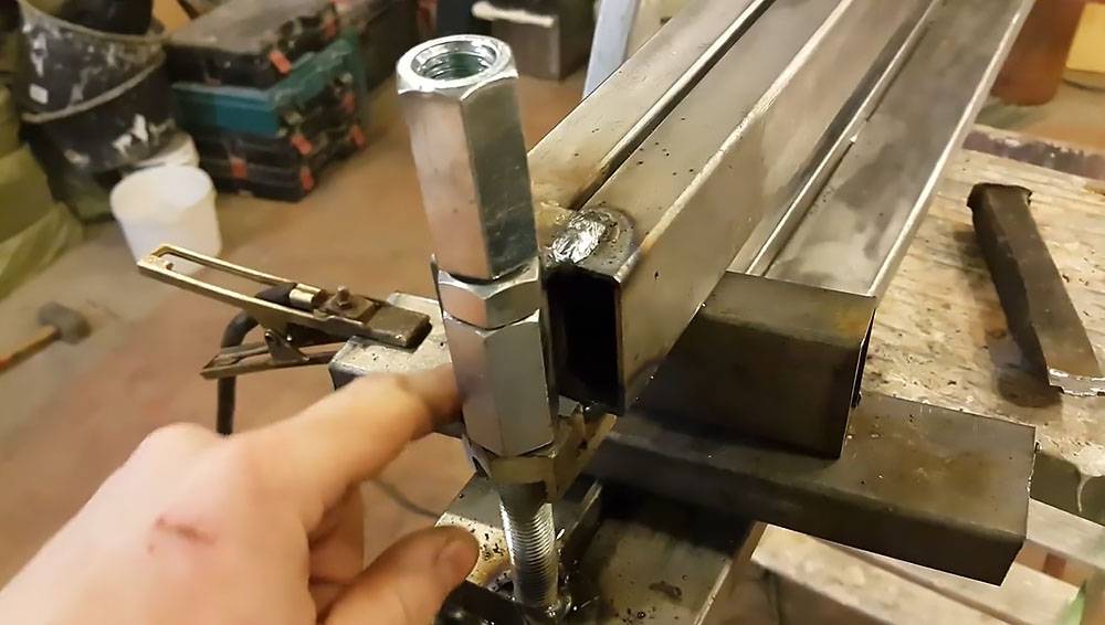 При этом важно между привариваемыми гайками оставить место для размещения ещё одной независимой гайки, которая будет использоваться для настройки высоты салазок
