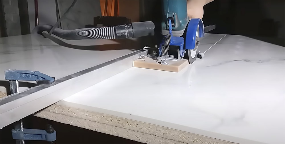 Зафиксированная плитка разрезается гриндером, который крепится сверху столешницы к прямолинейным рельсам-салазкам.