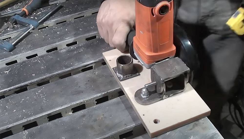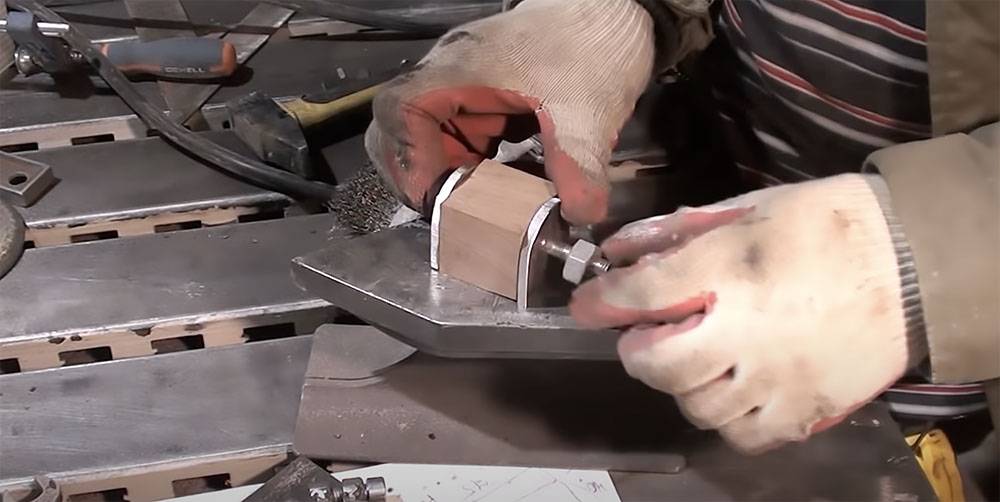 Следующий шаг — хомут соединяют сваркой с краем длинной стороны предварительно изготовленной детали Г-образной формы.
