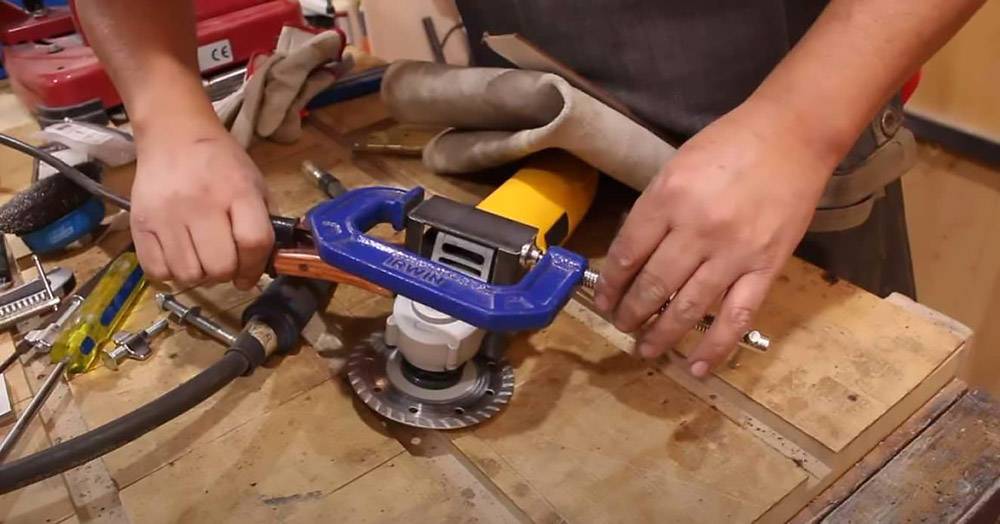 - Диск болгарки необходимо закрепить на рабочей поверхности. Делается это при помощи подготовленных заранее хомутов. Мастера рекомендуют поместить хомуты в резиновые трубки с целью более долгой службы.