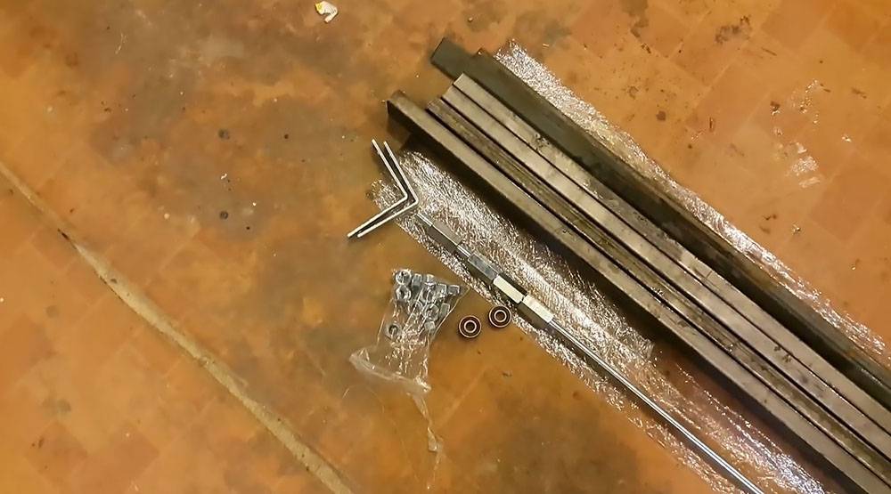 Нужно подготовить 4 трубы прямоугольного сечения 30 х 50 см, металлические уголки, стальные пластины, крепёжные болты, шпильки, подшипники и прочие расходные детали.