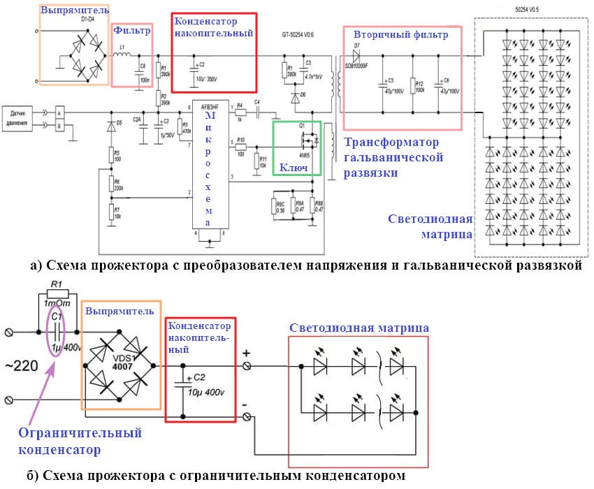 Практически любая из схем имеет накопительный конденсатор, способный накапливать заряд из высокоомных цепей и отдавать его для питания системы. В функцию светодиодного модуля входит: