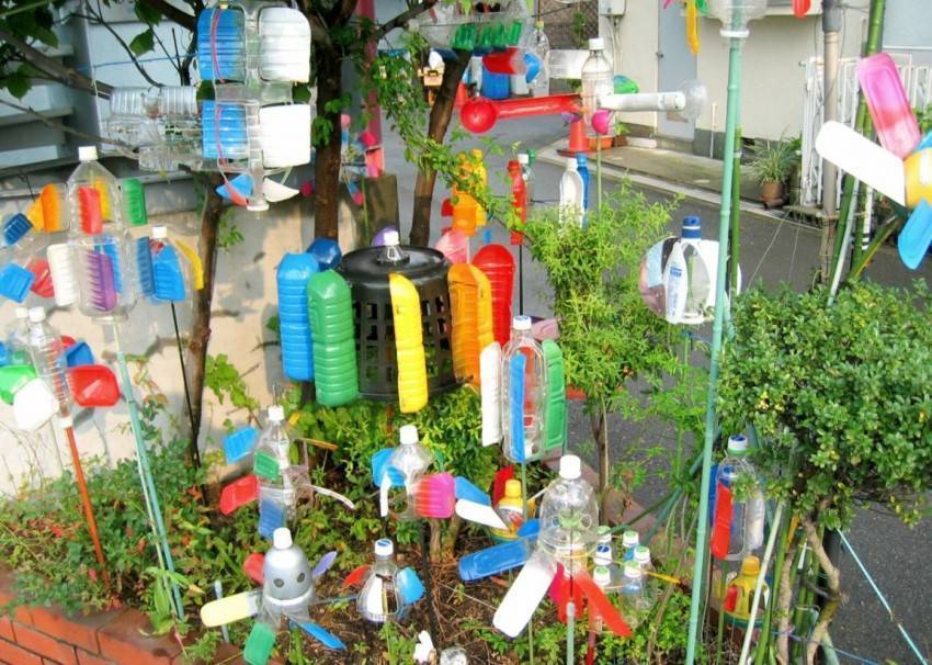 Ни для кого не будет удивительным использовать пластиковые бутылки в хозяйстве на своем участке. Из пластиковой тары, особенно большого объема, получаются вместительные горшки для цветов, рассады. Также тару можно использовать как заготовку для птичьих кормушек. Кроме того, из разноцветных емкостей можно самостоятельно смастерить различные декоративные фигуры для украшения участка.