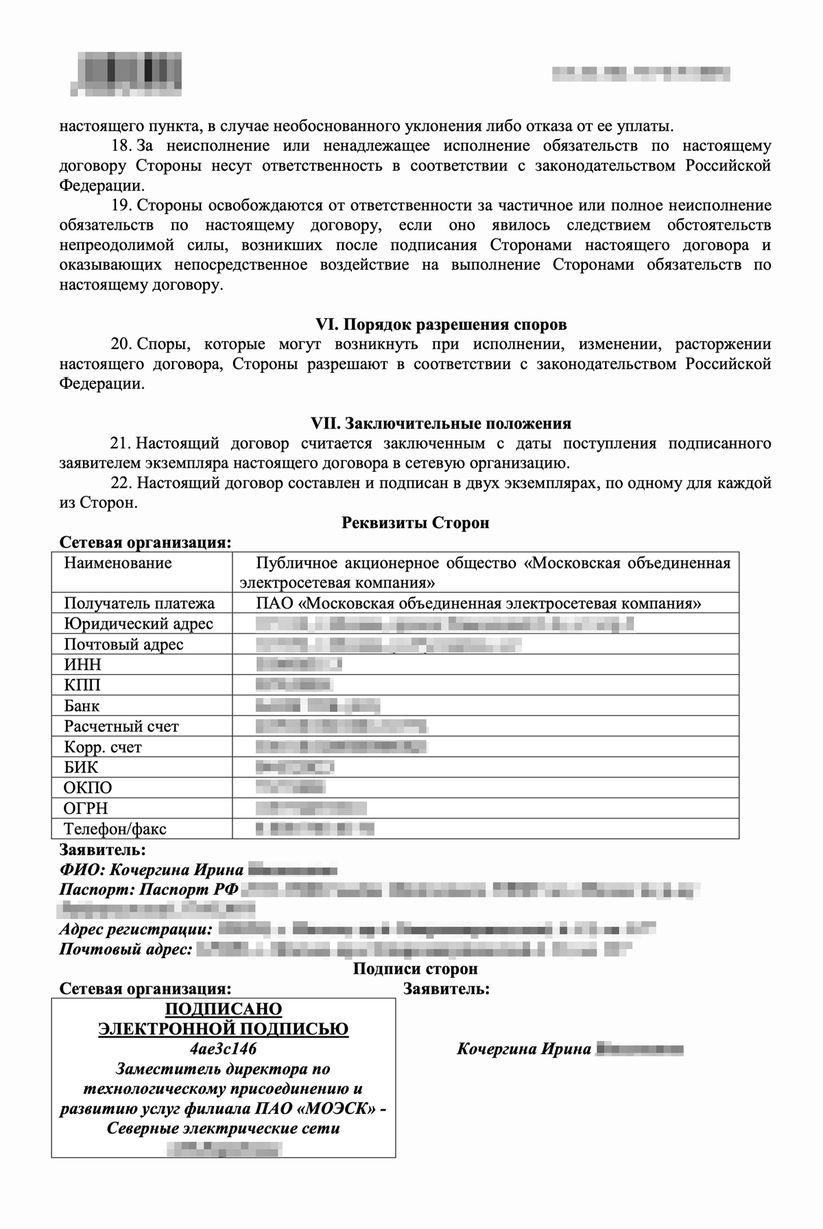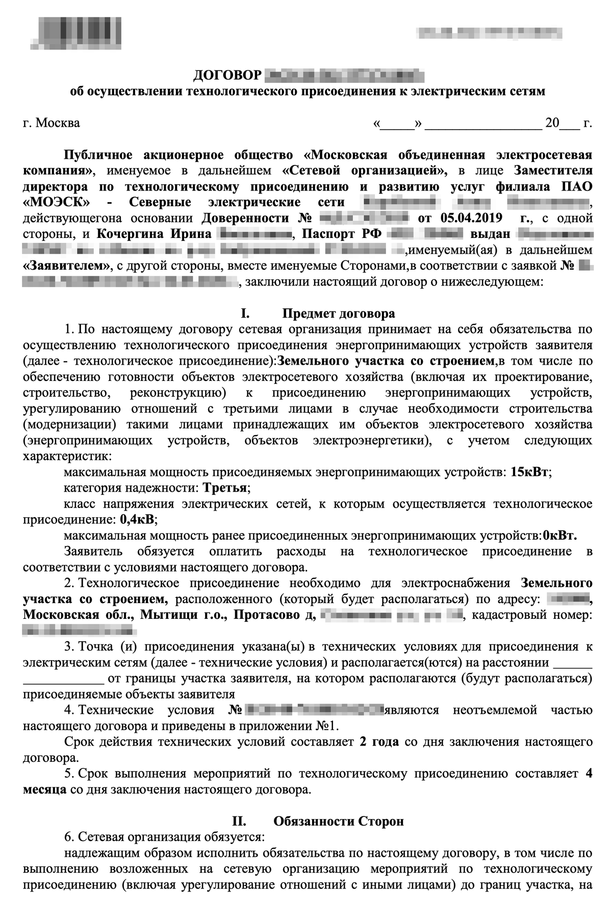 Когда заполнили форму и приложили документы, мы отправили заявку в МОЭСК. Через несколько дней в личный кабинет пришел договор технологического присоединения и квитанция на 550 Р: договор считают заключенным после оплаты счета. Также заявитель получает технические условия.