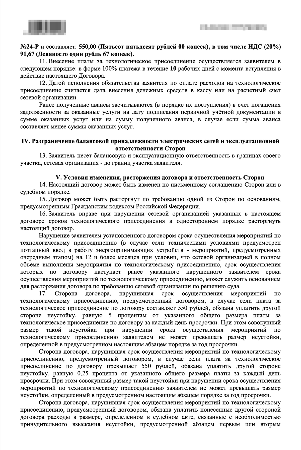 - Дождаться, когда сетевая компания направит заявителю заполненный и подписанный ею проект договора в 2 экземплярах, а также технические условия. Договор должен содержать перечень мероприятий по технологическому присоединению, сроки, обязательства сторон по реализации мероприятий, ответственность сторон, порядок расчетов. На этом этапе заявитель должен внести оплату в размере 550 руб.