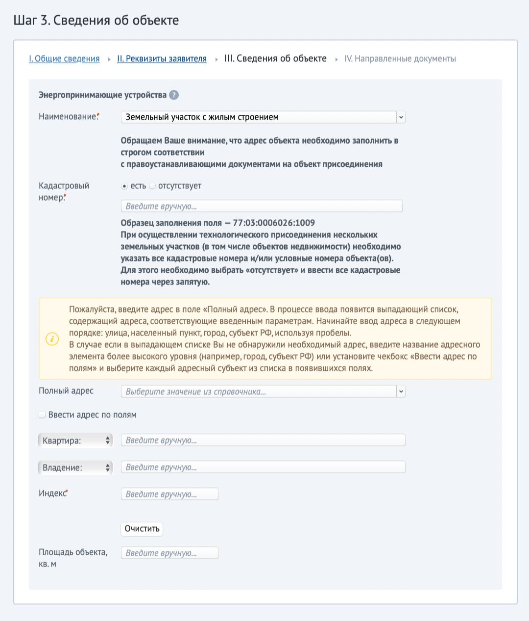 Затем необходимо заполнить информацию об объекте, к которому нужно подключить электричество, — в нашем случае это земельный участок с жилым строением