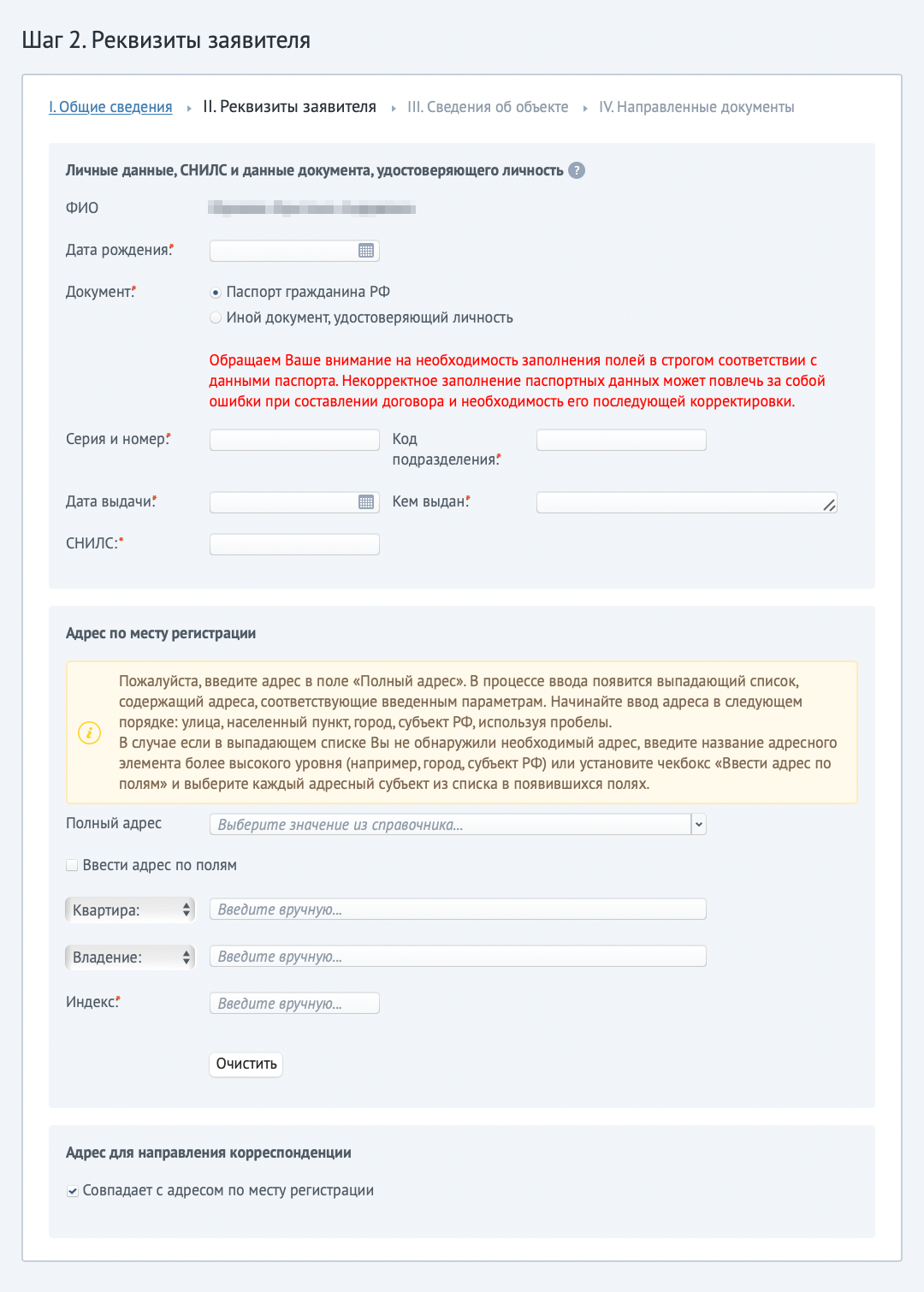 Следующий этап — реквизиты заявителя: ФИО, дата рождения, паспортные данные и адрес регистрации