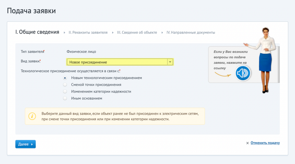 На странице подачи заявки на технологическое присоединение нужно выбрать «Новое присоединение» и нажать «Далее»
