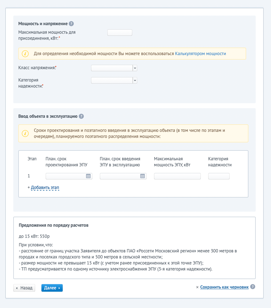 Здесь же можно выбрать необходимую мощность и категорию надежности — по умолчанию это 15 кВт и третья категория