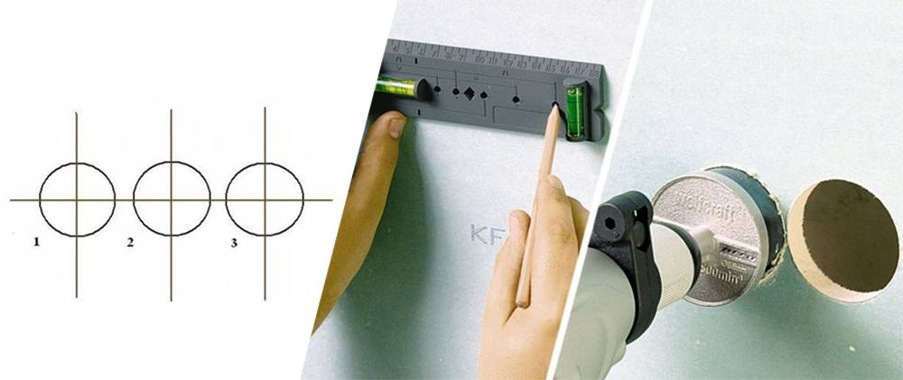 Идеальный вариант — использовать дрель с фрезой (коронкой) по гипсокартону для розеток. Диаметр фрезы — 6,8 см, она же используется для монтажных работ по установке точечных светильников. Порядок создания отверстия в стене таков: