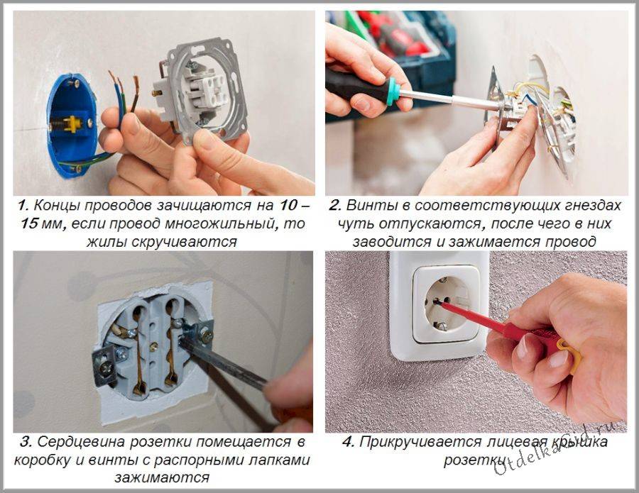 Важно! Ни в коем случае не забывайте об обесточивании проводки! Удар электрическим током может стать причиной смерти. Зачищаем около 8–10 мм изоляции для каждой жилы и ведем их в равноудаленные клеммы розетки