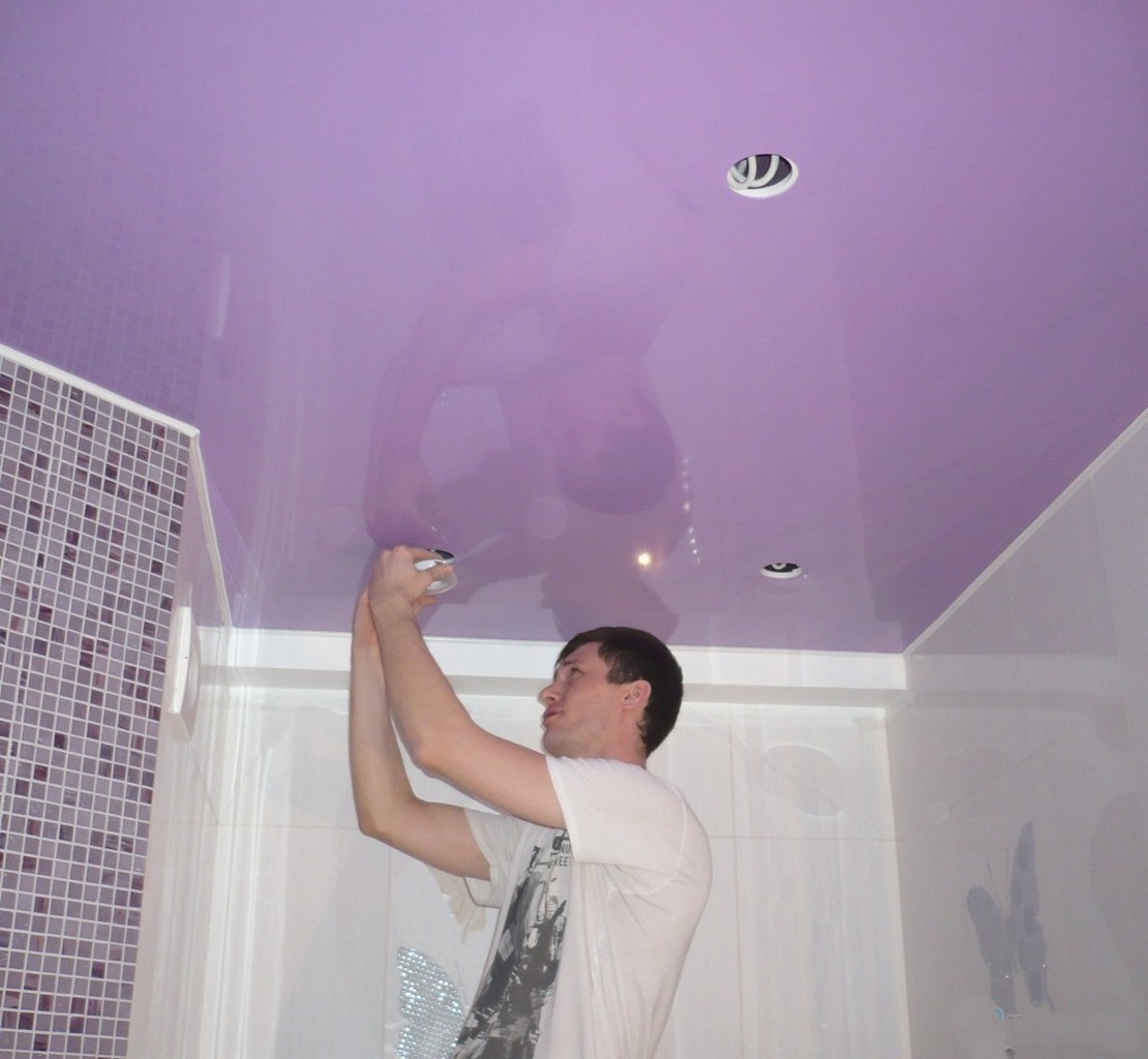 Если вы решили установить натяжной потолок в ванную комнату, выбрать подходящее покрытие несложно. Рекомендуется отдать предпочтение поливинилхлоридным пленкам, потому что их можно эксплуатировать при повышенной влажности. ПВХ полотна не портятся от контакта с водой и могут сдержать большие объемы жидкости, попадающие на потолок при затоплении сверху. Пленочные полотна можно мыть моющими средствами. Они монтируются после предварительного разогрева тепловой пушкой.