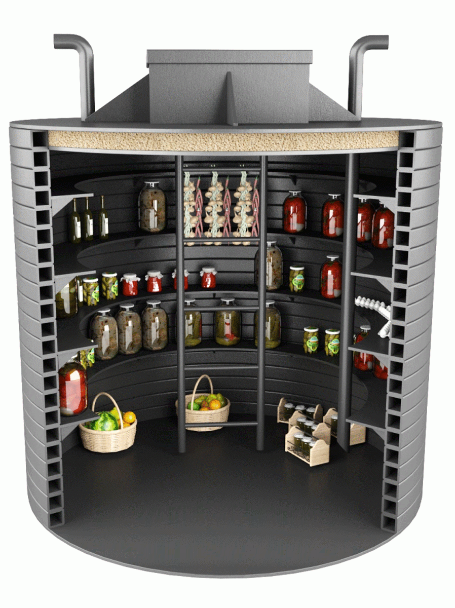 Такие подвалы чаще всего закладываются отдельно (а не под гаражом или домом), элементами служат ж/б изделия заводского качества высотой от 60 до 100 мм и диаметром от 0,7 до 2,5 м. Подходящими характеристиками обладают типы, используемые при обустройстве питьевых колодцев или септиков, их размеры должны быть максимально большими (насколько позволяет бюджет). При установке 1-3 штук друг на друга, изолировании основания и швов от проникновения грунтовых вод и заложении вентиляционных труб на выходе получается небольшое, но прочное сооружение с постоянным температурно-влажностным режимом.