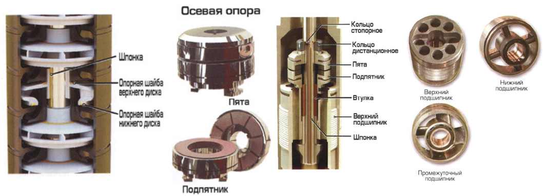 плавающие рабочие колеса. В устройствах такого типа центробежное колесо не зафиксировано на валу и может свободно передвигаться вдоль его оси по направляющей шпонке, вал при этом разгружен от рабочих колес, опираясь нижним концом на осевую опору. Для уменьшения трения в опорный диск центробежного колеса с двух сторон запрессовываются шайбы из износоустойчивого материала, при вращении они ложатся на кольцевые выступы, передающие вес колеса и его кинетическую энергию на корпус;