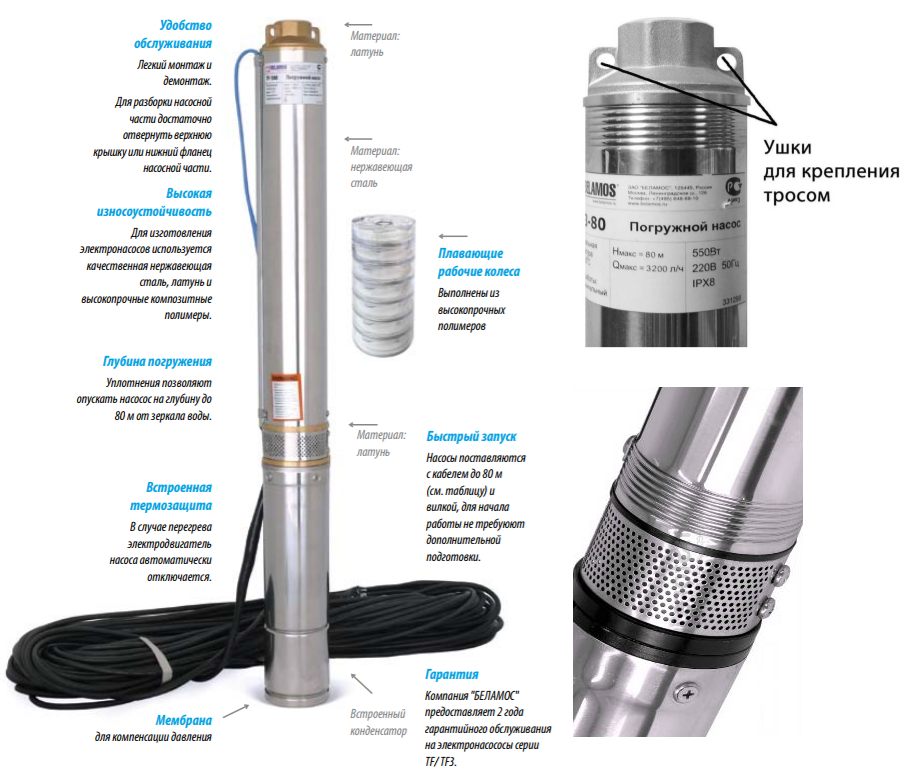 Погружной насос Беламос марки TF3 имеет следующие конструктивные особенности: