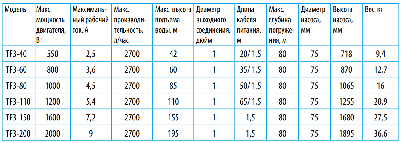 | Серия TF | Мощность, Вт | Высота подъёма воды в метрах | Производительность тысяч литр/час |