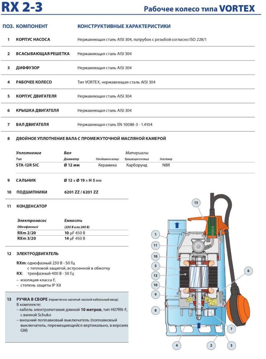 Рабочие элементы – колесо, уплотнения и прочее – выполняются из нержавеющих материалов.
