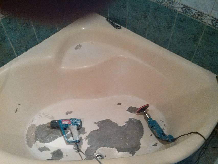 Если присутствуют небольшие трещинки или выбоины, то нужно затереть их обычной шпаклевкой для автомобилей. Опять зачистить и промыть начисто. Завершающий этап подготовки в прогреве ванны. Достаточно наполнить емкость теплой водой на 10-15 минут, слить и просушить поверхность строительным феном.