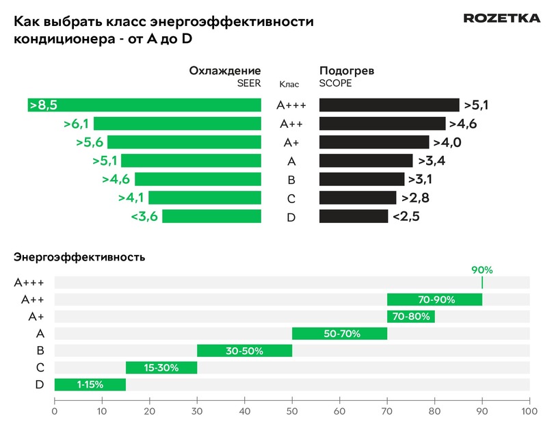Оправданно будет обратить внимание также на класс энергопотребления: чем он выше, тем меньше электричества будет потреблять кондиционер. Возможно, вы уже слышали про директивы Европейского Союза относительно новых стандартов энергетической эффективности для кондиционера – SEER и SCOP