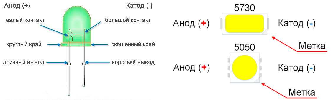 Нелишне обратить внимание и на ободок LED-детали. Многие производители предпочитают проставлять специальную маркировку-обозначение напротив катода