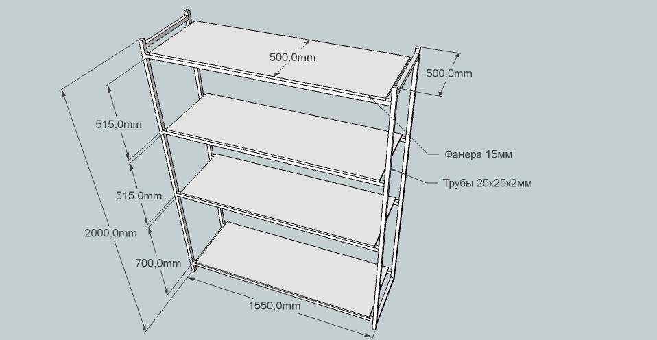 Стойки подобного стеллажа делаются из труб прямоугольного сечения или же из профиля с шириной одной из сторон 5 см. В качестве поперечин лучше всего подойдёт уголок 30 мм.