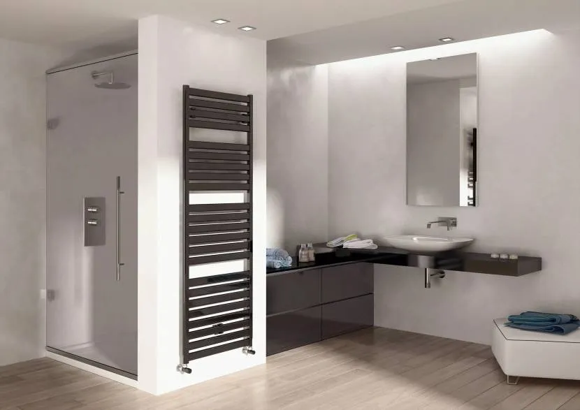Черная сталь. Не такая износостойкая как первый вариант, но полотенцесушитель в интерьере ванной комнаты из этого материала может исправно работать до 10 лет;