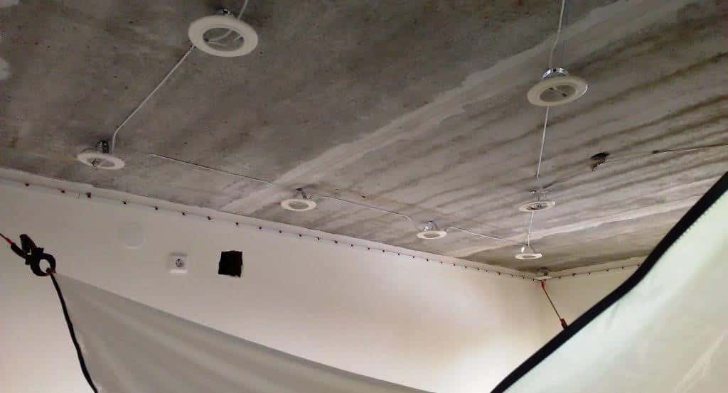 Шаг 3. На основании данных, полученных на предыдущих этапах, находится угол с наименьшей высотой. В этом месте выполняется замер расстояния от потолочного перекрытия до горизонтальной плоскости, в которой будет находиться потолок из гипсокартона. Высота подвесного потолка рассчитывается в зависимости от двух факторов – общей высоты помещения и тех коммуникаций и объектов, что нужно разместить между гипсокартоном и бетонным перекрытием. Оптимальное значение – от 50 до 65 мм, этого достаточно для укладки проводки и монтажа точечных светильников.