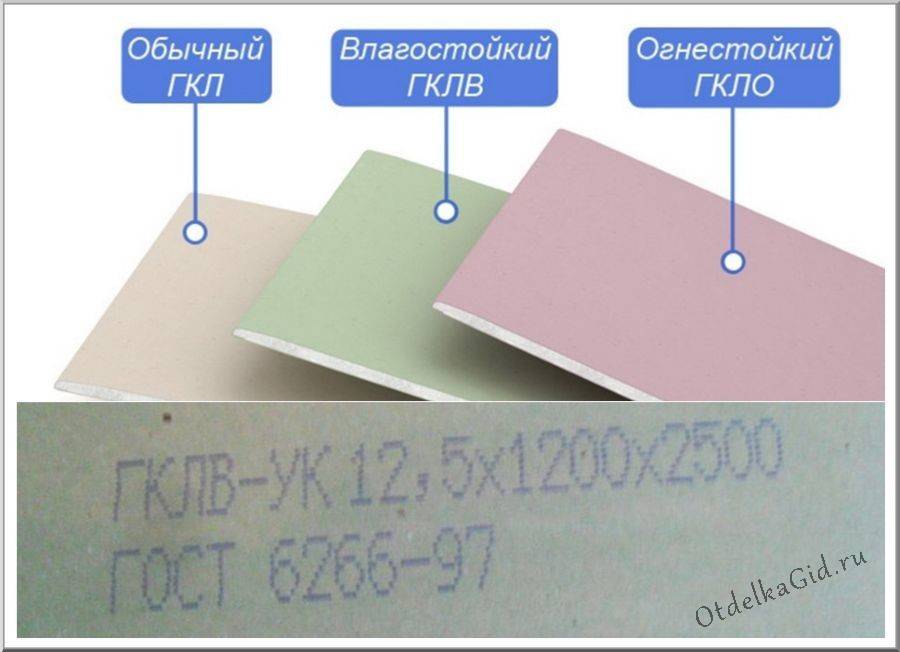 Влагостойкий гипсокартон можно легко отличить по зеленому цвету рубашки и характерной маркировке на обратной стороне листа – ГКЛВ