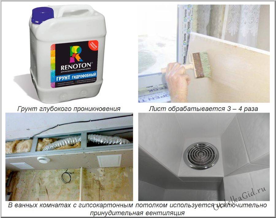 Для пропитки ГКЛ в ванной комнате используется специальный глубокопроникающий грунт, увеличивающий влагостойкость материала, а также устанавливается усиленная вентиляции