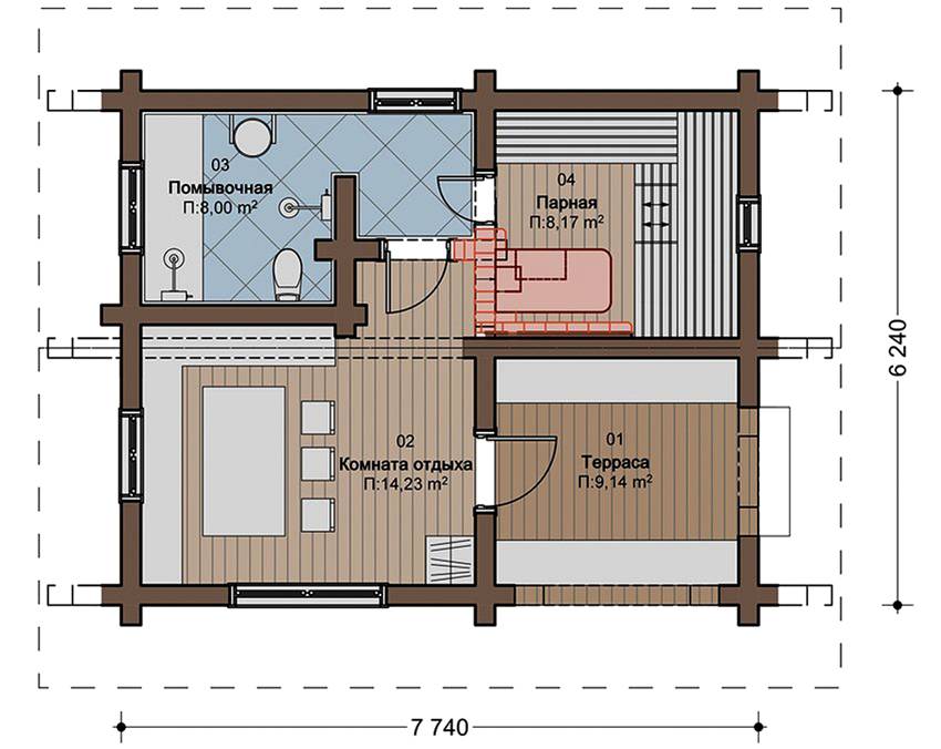 Проект бани размером 7,74 на 6,24 метра