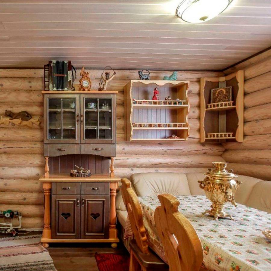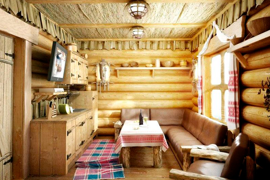 Традиционный интерьер для предбанника оформляется в русском стиле, который предусматривает использование напольной или настенной вешалки, обувной полки или тумбы, зеркала, столика, лавочек, дивана, бытовой техники и посуды.