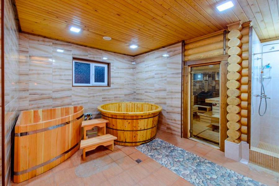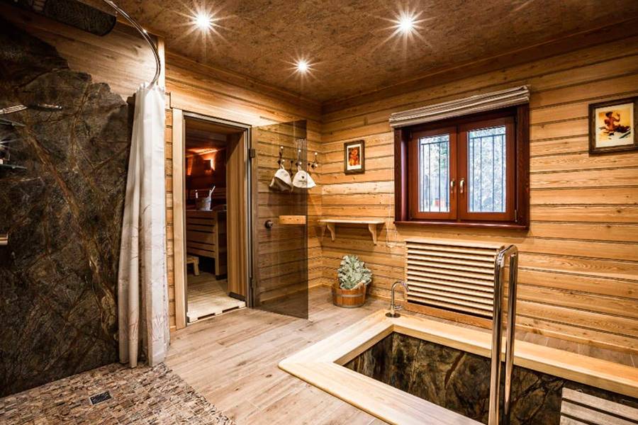 Достойной альтернативой дереву может выступить керамогранит, природный или искусственный камень. Можно подобрать интересную фактуру и сложный оттенок, чтобы придать своей бане яркую индивидуальность.