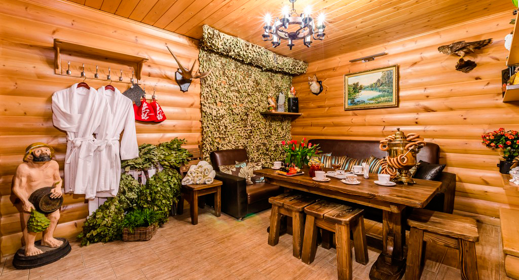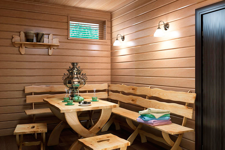 В совмещенном варианте, когда придется раздеваться в комнате отдыха, разумно будет отделать ее интерьер с учетом этой особенности. Здесь уж, как говорилось ранее, широкий простор для применения Ваших задумок и фантазий. Можно взять за образец и один из понравившихся Вам интерьеров современной или классической бани и доработать его под свои потребности. А можно пойти и другим путем – разработать интерьер с нуля, привнеся в него традиции русской бани или финской сауны.