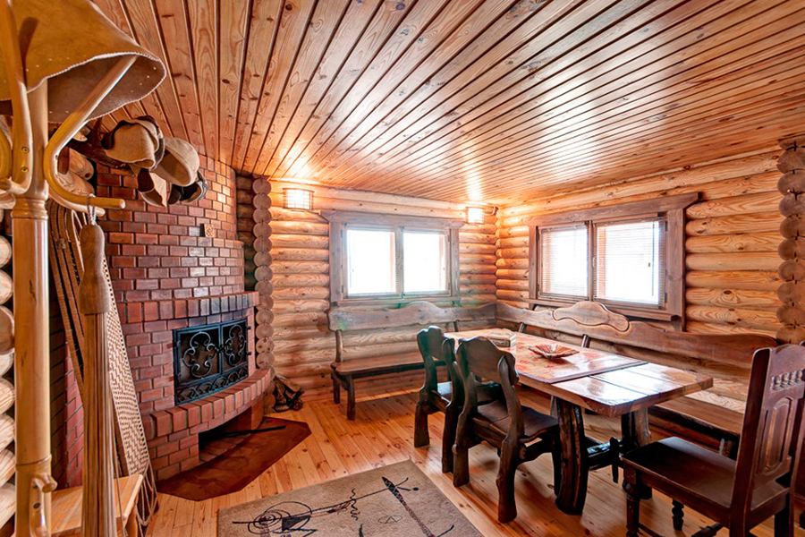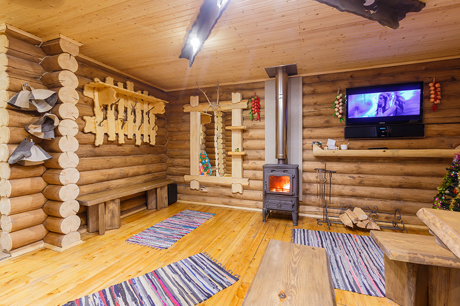 Древесиной облицовывают не только стены, но и полы. Впрочем, для отделки последних можно использовать и керамическую плитку, а место, где обустраивают топку, облицовывают кирпичом. Непосредственно под покрытием пола применяют перлит – это песок, отличающийся хорошими теплоизоляционными свойствами. Этот материал очень легкий, поэтому он оптимален для использования в помещениях закрытого типа, где нет ветра, в противном случае его раздует.