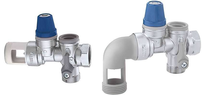 Следующее изображение демонстрирует клапаны без рычажка принудительного удаления жидкости. Левая модель имеет в верхней части закреплённую на резьбе крышку. Она предназначена для технического обслуживания предохранителей. При необходимости ее откручивают для удаления засоров, накипи и прочих загрязнителей.
