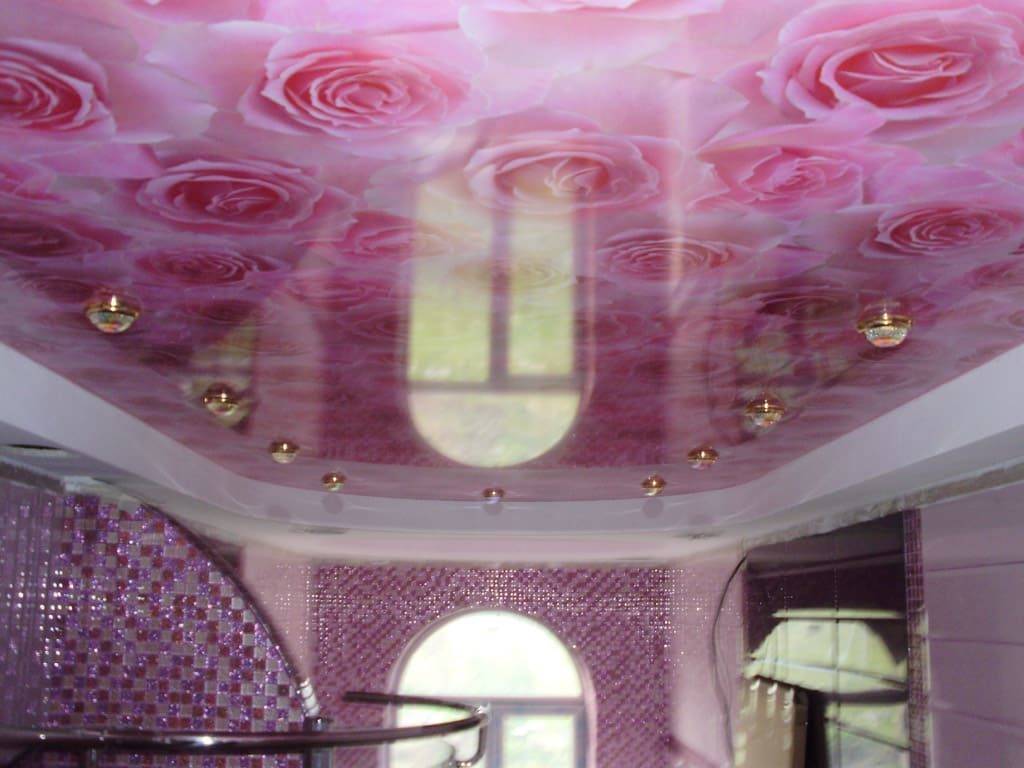 Благодаря многообразию цветов, фактур и возможности нанесения изображений на полотно, существует масса вариантов оформления потолка в ванной комнате. Для дизайна можно выбрать одноуровневые или двухуровневые конструкции, а также использовать покрытия с рисунком.