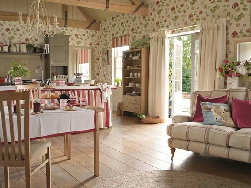 - Стены оштукатуриваются, окрашиваются или оклеиваются простыми обоями, желательно с цветочными узорами. Могут использовать деревянные или каменные вставки, зонированые поверхности. Единственное, что нужно учитывать – их внешний вид должен как можно ближе соответствовать простому деревенскому стилю.