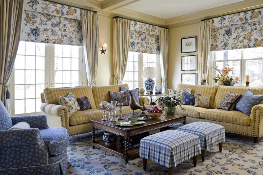 Обилие натурального текстиля способно наполнить деревенской романтикой интерьер в стиле кантри, что создает в помещении характерный антураж. Здесь используют лен, хлопок, ситец, мешковину и холщовое полотно. Изделия могут быть однотонными, в полоску, мелкую клетку, горошек.