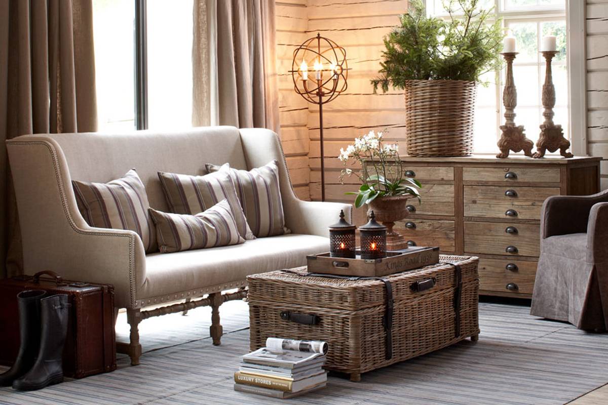 Деревянная мебель только из натурального дерева. Массивная и добротная, словно вырубленная топором. Покрывало мягкой мебели с расцветкой и узором, отвечающим традициям той эпохи. Обивка диванов и кресел, только соответствующая моде прошлого века. В любом стиле кантри, вне зависимости от национальной принадлежности, отлично смотрятся предметы из плетёной лозы, кованного металла. Мебельные фасады – строго без декоративных элементов: простые ручки дверей, отсутствие лакированных покрытий, только матовые. Допускаются потёртости, частичные сколы