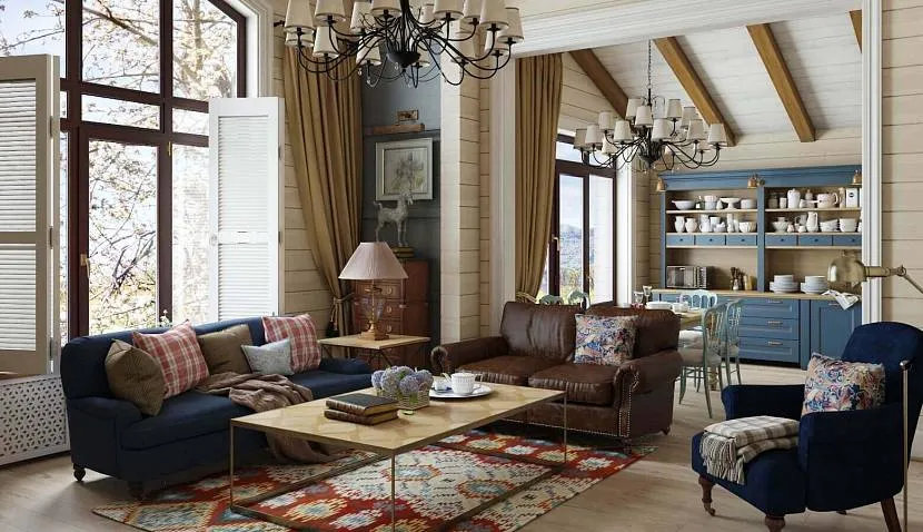 В отдельных элементах интерьера в кантри-стиле могут просматриваться старинные национальные признаки. Например, принадлежность к английской старине будет прослеживаться в клетчатом покрывале, к русской – в кружевном, вышитом полотенце или стоящем на столе самоваре. Американская этническая классика подразумевается с применением открытых, прямоугольных потолочных балок, напоминающем об ушедшей эпохе ковбоев огнестрельным оружием на стене.