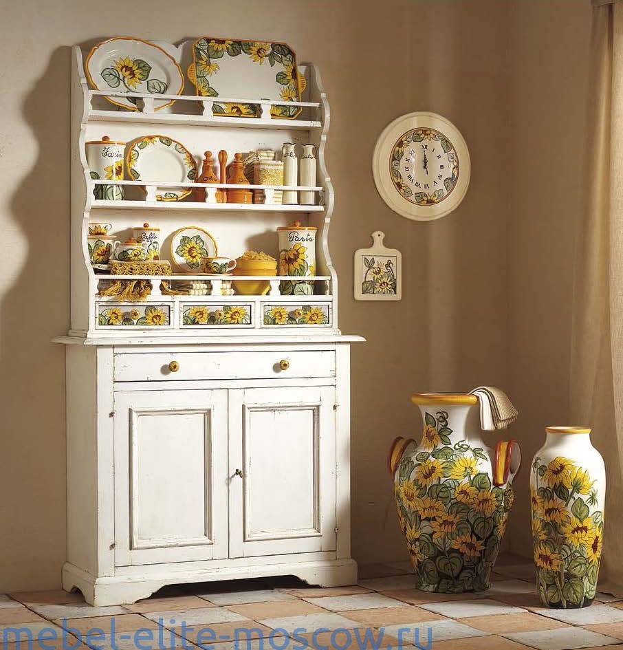 Отлично смотрятся буфеты, добротные столы, скамьи, навесные шкафы, открытые полки. Корзины, сундуки, короба, кресла-качалки будут идеальным дополнением.