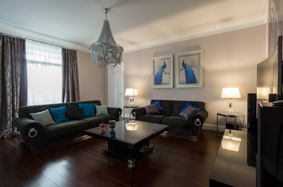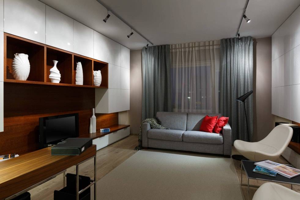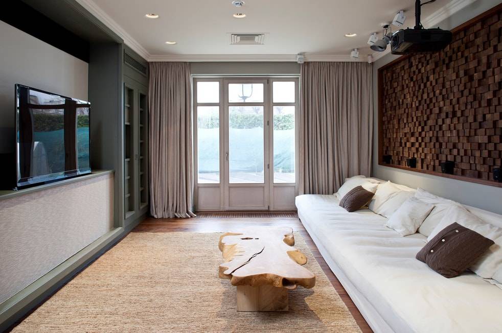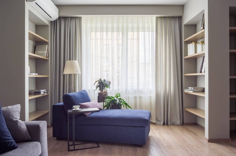 Объемные, громоздкие варианты ни в коем случае нельзя приобретать в зал небольшого размера. Намного более подходящими будут легкие, полупрозрачные шторы, которые сделают помещение визуально больше.